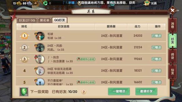 《寻仙手游》加满50个好友(苹果安卓区、微信QQ)可以领90个低级强化石,直接在游戏内领取,每天还可以互赠灵力。